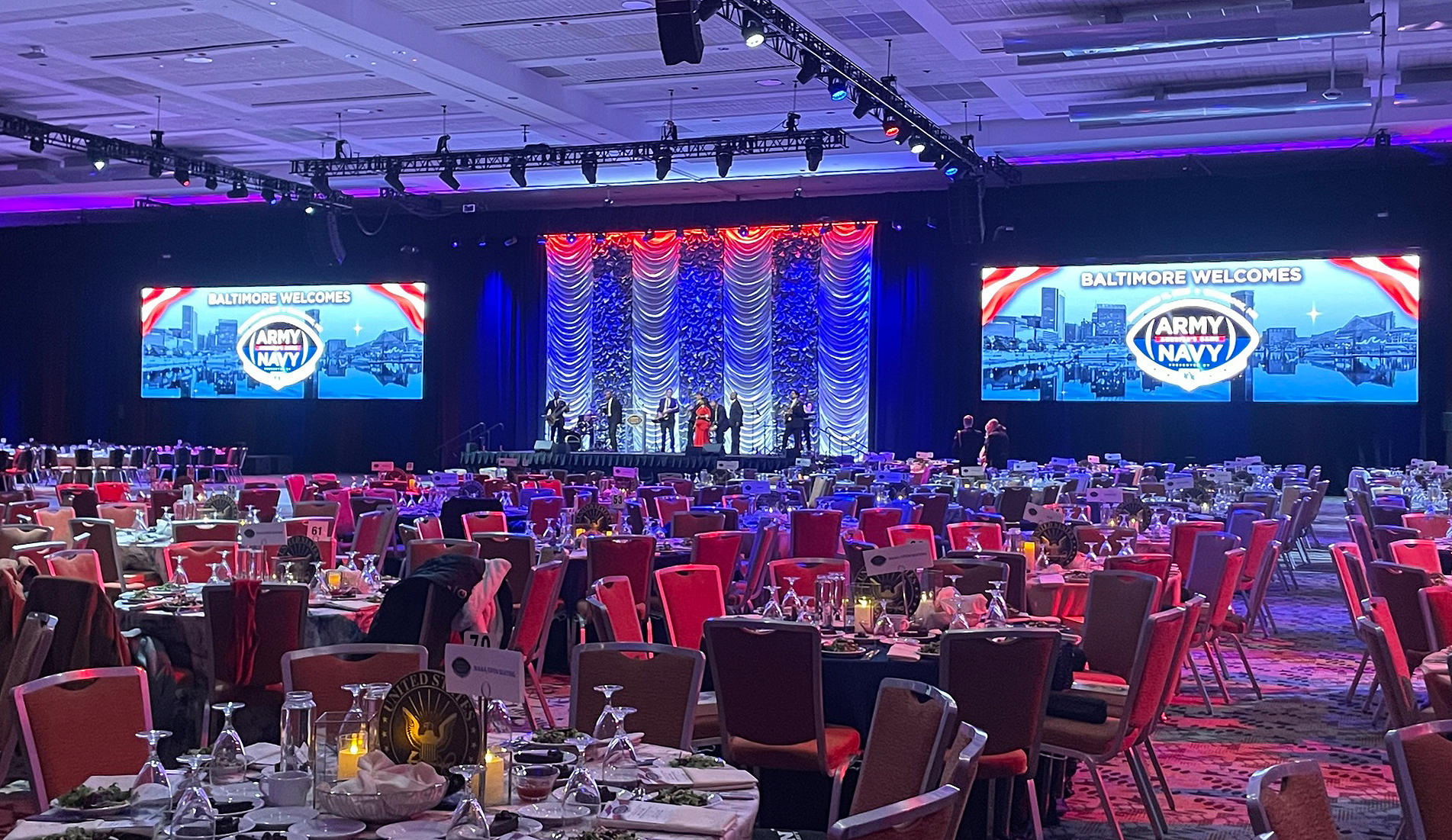 The designer created a dynamic walk-in look with slow-moving effects, carrying a red, white, and blue theme from the national anthem into the dinner look. "It provided a calm look for dinner in colors that represented both the Army and Navy," Rupp explained. "They really liked that look and being able to carefully frame and focus the PARAGONs to place the blue precisely in the center of the onstage scenic piece added a three-dimensional effect that was really striking."